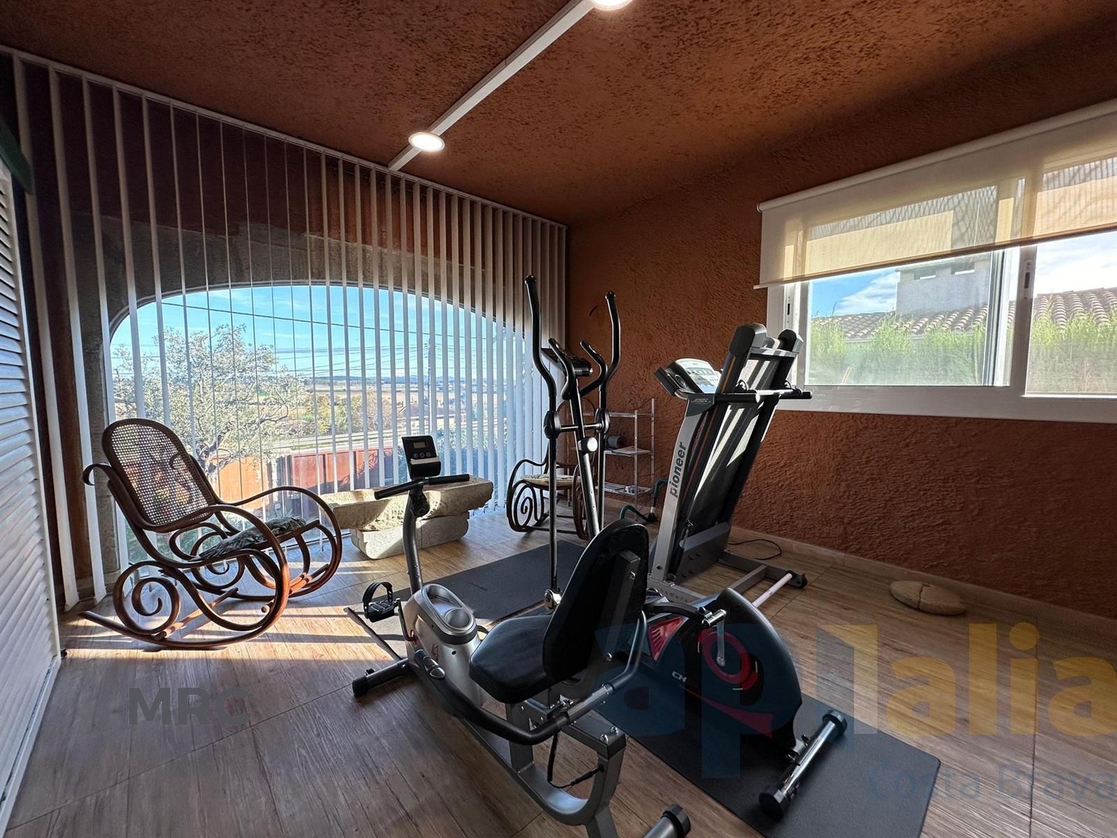 Planta baixa: espai de dia ampli amb saló, cuina-menjador, tres dormitoris, bany, gimnàs, safareig i dos porxos (un d’envidrat) amb vistes al jardí i la piscina.